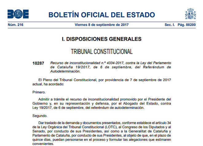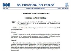 Este es el documento que prueba el movimiento de fichas por parte del Ejecutivo. El Boletín Oficial del Estado (BOE) ya ha publicado la admisión a trámite por parte del Tribunal Constitucional de los recursos del Gobierno contra la convocatoria del referéndum en Cataluña y otras medidas del Parlament para su desarrollo, con lo que han quedado oficialmente suspendidas.