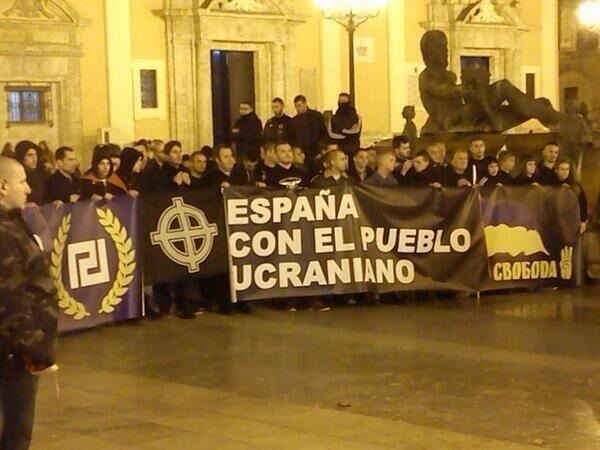 En apoyo de este objetivo o misión se adopta también el uso de medios de acción indirectos y asimétricos, como los ya mencionados durante el presente análisis; así como de fuerzas políticas y movimientos sociales financiados y dirigidos desde el exterior, por parte de las comunidades locales convencidas con la causa " nacional ". Son paradigmáticas en este punto las manifestaciones del Maidán que se produjeron durante el año 2013 en diferentes ciudades españolas, en especial en Valencia y Madrid, y más recientemente las manifestaciones durante este año 2017 en Valencia, como podemos observar en la foto que encabeza el artículo en apoyo a la causa nacionalista ucraniana. Sobre este punto en concreto hablaremos en profundidad desde este Diario, Dios mediante, en el futuro pues el tema da para ello.