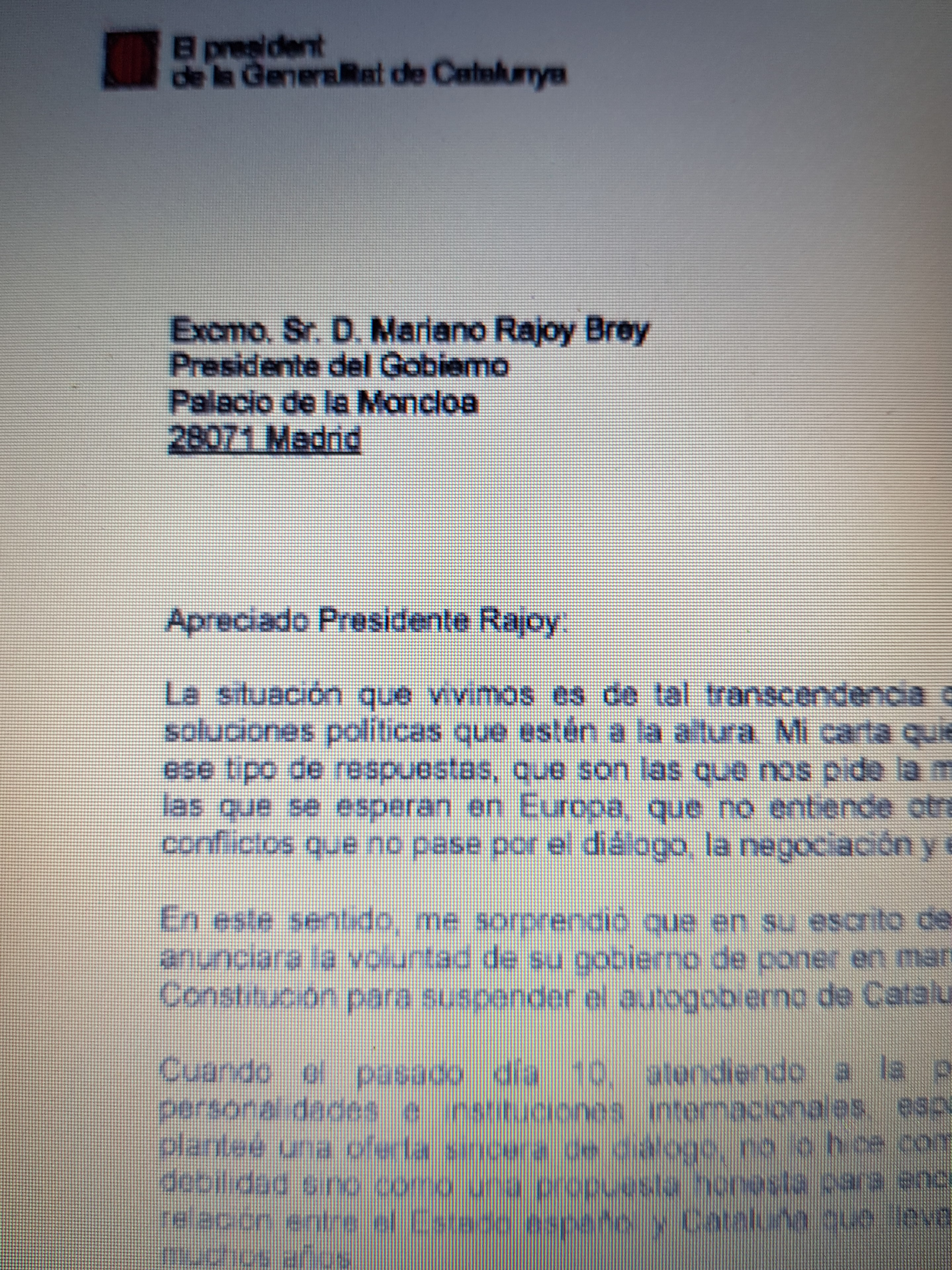 Redacción. Hay que leer más que nunca entre líneas. El president de la Generalitat, Carles Puigdemont, ha respondido a Mariano Rajoy sin moverse de sus posiciones y con la advertencia de reactivar la independencia de Cataluña si, como se prevé, el Gobierno suspende la autonomía de Cataluña. "Si el Gobierno del Estado persiste en impedir el diálogo y continuar la represión, el Parlament podrá proceder, si lo estima oportuno, a votar la declaración formal de la independencia que no votó el 10 de octubre", finaliza la carta.