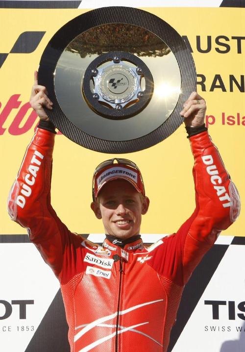 Redacción Madrid. 5 do octubre. El piloto Casey Stoner (Ducati) ejerció de profeta en su tierra apuntalando el subcampeonato mundial en MotoGP tras lograr la victoria en el Gran Premio de Australia, donde el francés Mike Di Meglio (Derbi) conquistó su primer cetro mundial en 125cc y el italiano Marco Simoncelli (Gilera) cerró las puertas de forma casi definitiva a Álvaro Bautista (Aprilia) en 250cc.