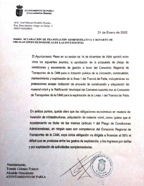 El PP de Castilla-La Mancha quiere dejar muy claro que el secretario general del PSOE-PSM, Tomás Gómez, miente cuando intenta culpar a la secretaria general del PP, María Dolores de Cospedal, de adjudicar el contrato de construcción del tranvía de Parla.