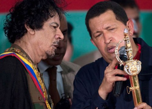 Gadafi acepta a Chávez como mediador. Dios (o Alá) les crea y ellos se juntan. El bolivariano lleva desde el lunes con sus mensajes; “¿por qué no enviamos una comisión de buena voluntad que vaya a tratar de ayudar a que no se sigan matando en Libia?" "Estados Unidos estoy seguro de que está exagerando y está distorsionando las cosas para justificar una invasión", “no voy a condenar a quien ha sido mi amigo por mucho tiempo sin saber exactamente lo que en Libia está ocurriendo".