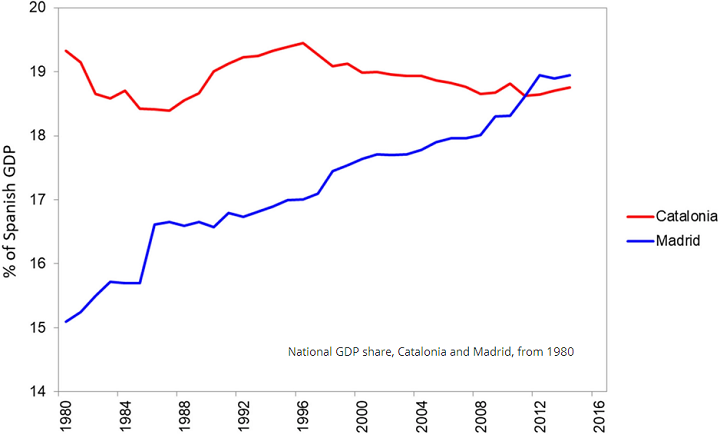 Mientras que Madrid ha dado paso a convertirse en una ciudad global y dinámica, Barcelona ha ido descendiendo gradualmente en crecimiento demográfico y económico. Todos los indicadores apuntan a la hegemonía de Madrid sobre Barcelona: PIB, PIB per cápita, desempleo, inversión extranjera directa, creación de empresa… Todo ello dando al traste con una evolución muy positiva de Barcelona, desde principios de la década de 1980, en que se colocaba a Barcelona como la ciudad española con mayores perspectivas económicas. Tendencias que se han frustrado a partir de principios de los años 90.