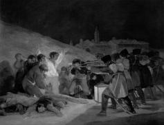 Estamos en el Palacio de Grimaldi, casi frente al Palacio Real. Un pelotón de soldados nos espera allí. Rodean a un grupo de paisanos al que nos unimos. A culatazos y gritos nos llevan cuesta abajo hacia un lugar sin luz alguna. Se oyen a lo lejos ruidos confusos de tiros y gritos. Cuando terminamos la bajada me doy cuenta de que allí se debería encontrar la Plaza de España y, simplemente, no está. A la derecha se adivina, a unos doscientos metros, el perfil de un cuartel. Nos hacen girar hacia la izquierda. Delante sólo tenemos un monte oscuro. Siento un escalofrío por el fresco de la noche.