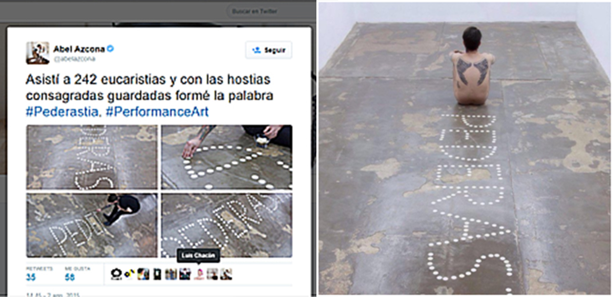 En todo caso, estas actividades deberán estar a tono con la naturaleza y origen de la edificación, cuidando el propietario de mantener en el interior del edificio el orden y debido respeto a la Cripta. Parece evidente que el actual Ayuntamiento no ha cumplido estas condiciones de la cesión ni a la institución que se la cedió. Las Formas, para mayor escarnio, estaban encima de lo que fue el altar mayor. Las fotos, incluidas las que recogen la palabra “pederastia” formada con Hostias (supuestamente consagradas), por el resto del antiguo templo (menos la cripta). Es todo muy simbólico: Formas con las que comulgaban los voluntarios del frente, la festividad de Cristo Rey que fue el grito de los combatientes... Es una provocación en toda regla.