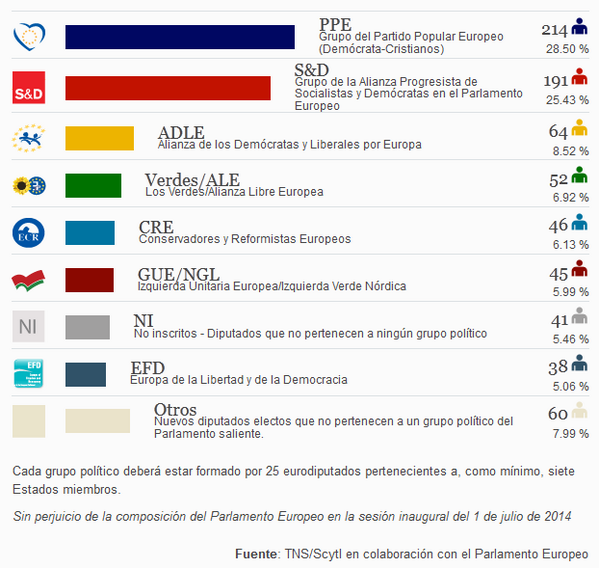 El 1 de julio, en la sesión inaugural, habrá nueva composición del Parlamento Europeo. A día de hoy, y tras lo resultados en toda Europa, oficialmente esta es la composición. Gana el Partido Popular Europeo.