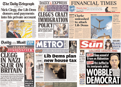 La prensa británica favorable al Partido Conservador y al Partido Laborista no se anda con chiquitas. Ante la posibilida de convertirse en la sorpresa electoral, han apuntado sus dardos hacia este joven político. El líder del Partido Liberal Demócrata, Nick Clegg, ha sido objeto de los ataques de los diarios conservadores por diferentes donaciones recibidas en 2006 y por las políticas diseñadas por su partido.