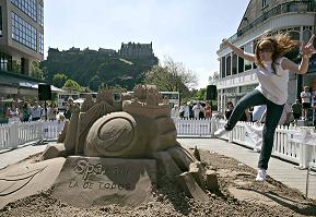 El viernes 21 de mayo se inauguró la nueva ruta Barcelona-Edimburgo que conectará ambas ciudades con cuatro vuelos semanales. Para celebrarlo, durante toda la semana pasada una artista local construyó en el centro de Edimburgo un inmenso castillo de arena compuesto por diversos edificios emblemáticos de ambas ciudades. Ayer sábado, los paseantes que se acercaron a observar la obra del artista pudieron participar en la búsqueda de 100 billetes de avión gratuitos escondidos en el interior de la escultura de arena.