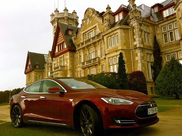 Aunque podríamos haber recargado, a mitad de camino, en el punto de recarga rápida del precioso Parador de Lerma, no ha sido necesario porque hemos utilizado, para nuestro viaje, el nuevo modelo de la innovadora marca americana Tesla. El model S, nº1 ventas en Noruega, nº1 en seguridad y líder en su segmento en los EEUU. Según los datos oficiales, su autonomía es de 500 km, y ya hay algún conductor que ha afirmado alcanzar los 620 km. Aún así, no teníamos tan claro que fuéramos capaces de llegar al mar cantábrico, con una sola carga, teniendo que salvar dos importantes puertos de montaña, Somosierra y El Escudo, con cotas de 1444 y 1011 metros respectivamente.