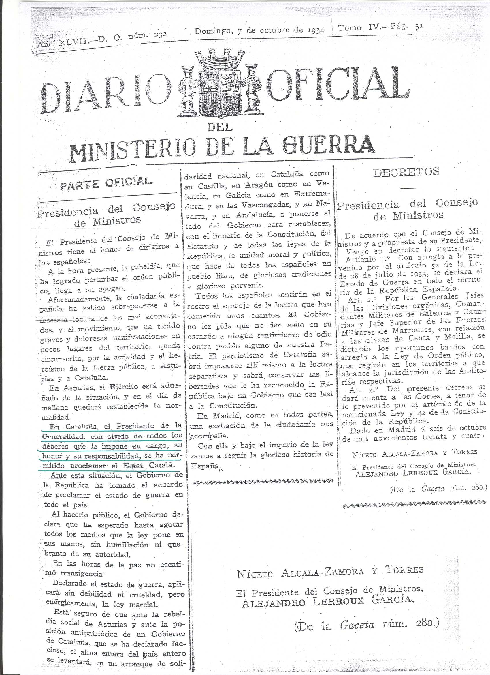 ¡Que diferencia! Incluso con la segunda República. Este documento de aquella época, del siete de octubre de 1934, dice textualmente: "En Cataluña, el presidente de la Generalidad, con olvido de todos los deberes que le impone la cargo, su honor y su responsabilidad, se ha permitido proclamar el Estat Catalá. Ante esta situación, el Gobierno de la República ha tomado el acuerdo de proclamar el estado de guerra en todo el país". Que tomen nota...