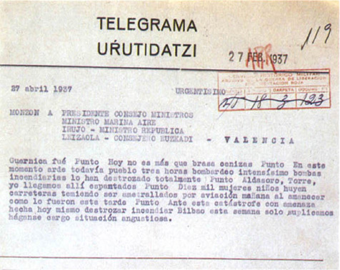Nota del DiarioYA: Como ejemplo de manipulación, nótese cómo en el telegrama dónde se comunnica al gobierno el bombardeo se da la cifra de huida de 10.000 niños y mujeres, cuando en todo el pueblo no había ese número de habitantes, hombres incluídos.
