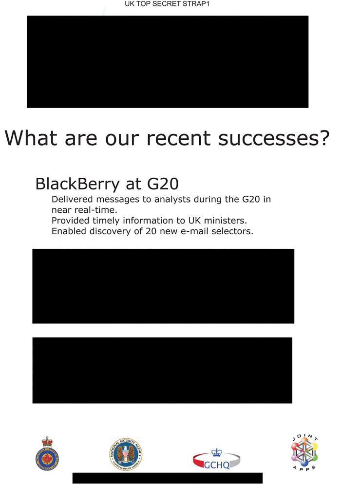Al parecer, el GCHQ creó cibercafés para acceder a los correos electrónicos de las delegaciones extranjeras, se infiltró en sus teléfonos móviles para escuchar sus llamadas y desplegó a un equipo de 45 analistas para analizar toda la información en tiempo real.