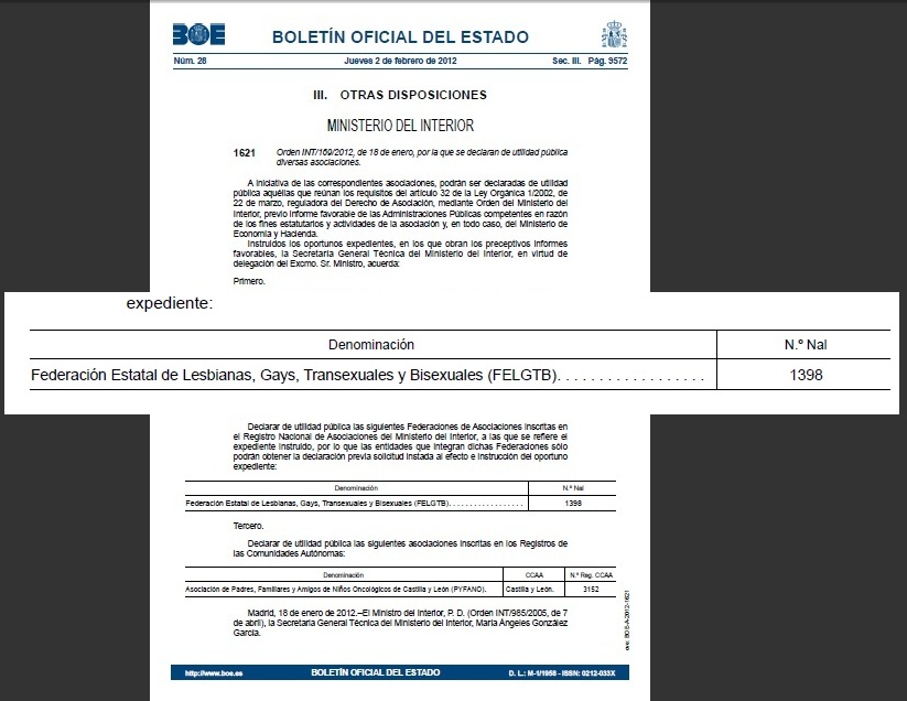 Redacción. Sin comentarios. El Ministerio del Interior ha dado a conocer mediante una resolución publicada el pasado 18 de enero la nueva consideración de la Federación Estatal de Lesbianas, Gays, Transexuales y Bisexuales (FELGTB) como una "entidad de utilidad pública". Veamos a ver lo que dicen desde Universo Gay: