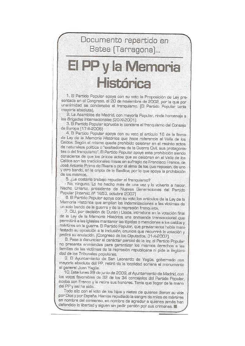 El presente documento demuestra la actitud del Partido Popular con respecto a sus actuaciones en relación a las condenas del pasado y a la ley de la Memoria Histórica. No tiene desperdicio.