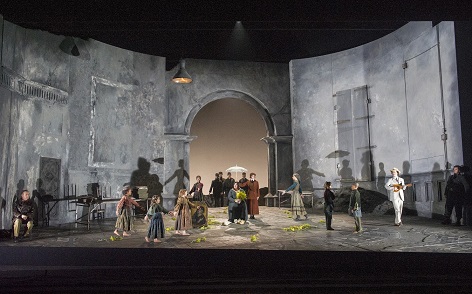 Este Othello ha sido coproducido con la English National Ópera y la Kungliga Operan de Estocolmo, estrenada en septiembre de 2014 con gran éxito en esta última, con David Alden como director escénico, que centra su acción en un espacio demasiado abietrto de una sombría y derruida ciudad mediterránea, que sirve de único escenario para el total desarrollo de este drama lírico.