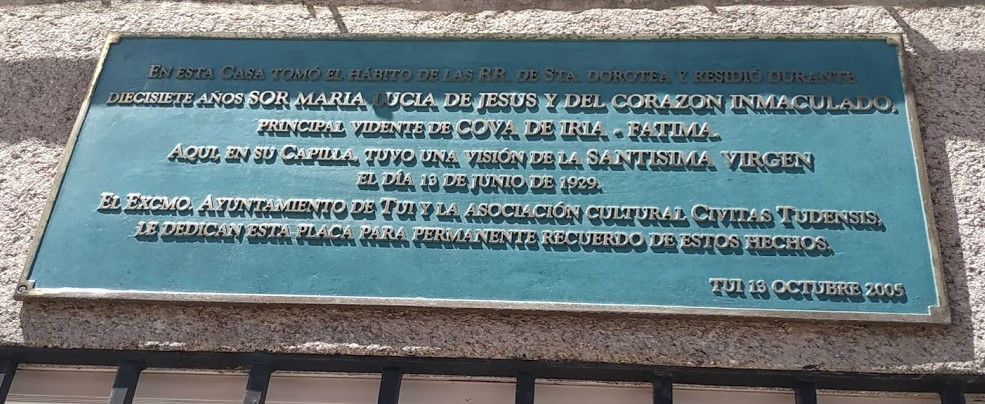 La vidente Sor Lucía había cumplido los 18 años, el 24 de octubre de 1925, vivía entonces con el seudónimo María de los Dolores, así con este nombre había permanecido en Oporto. Llegó a Tuy acompañada de la Madre Provincial de Santa Dorotea, permaneció allí desde el 25 de octubre de 1925 hasta el 16 de julio del 1926. El 3 de octubre de 1928, pronuncia sus votos religiosos. Recibe el mandato de regresar a la casa de Santa Dorotea de Pontevedra, en la que permanecerá hasta mayo de 1937, en que regresa a Tuy. Es en este espacio de tiempo en el que Nuestra Señora le explica el contenido de los mensajes de la aparición del 13 de julio de 1917.