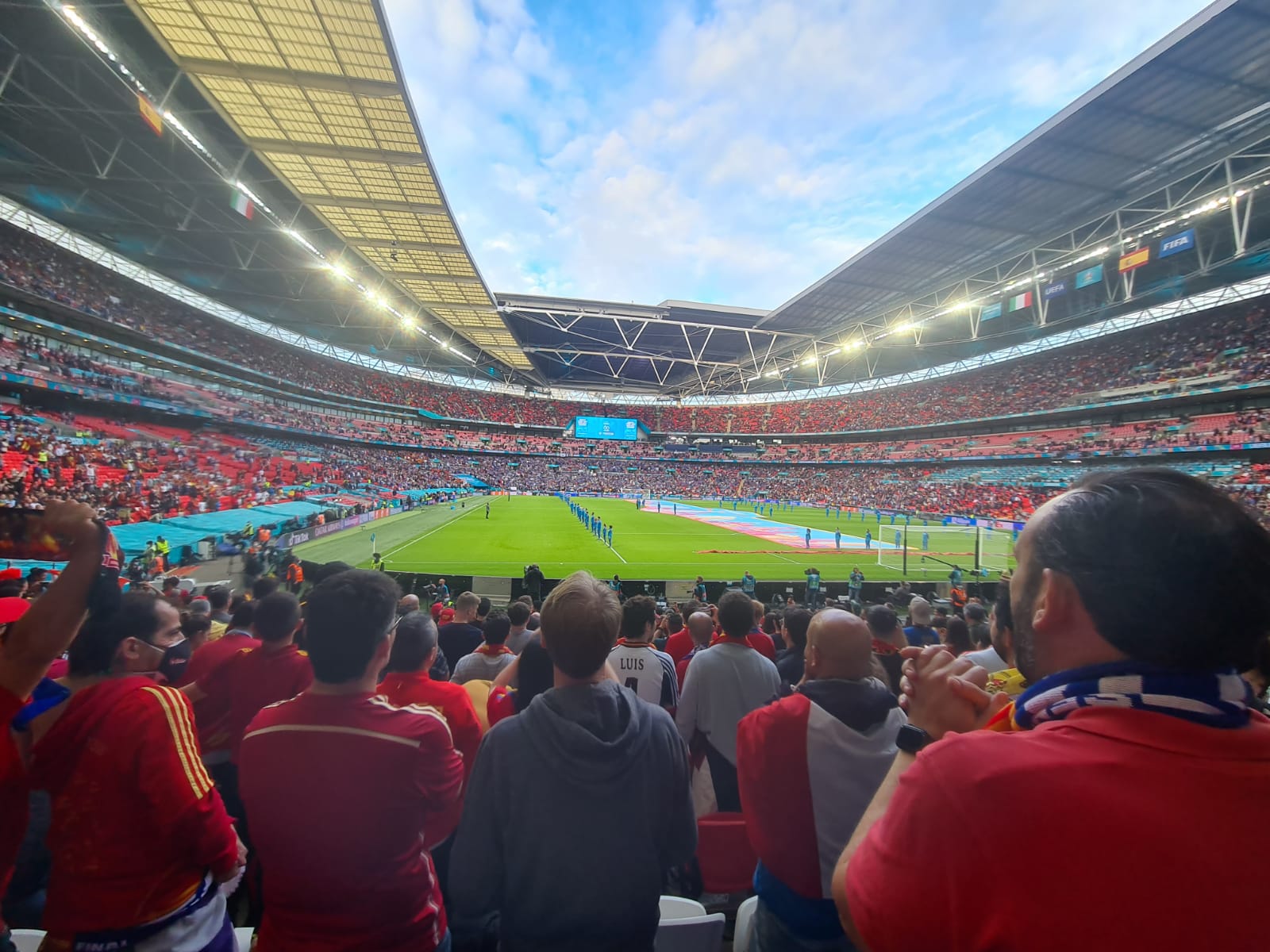 Mi aplicación en el móvil para probar mi doble vacunación no funcionaba, pero oigan, “No problem, keep going”, y una vez dentro del estadio un miembro de personal del estadio se acercó para decirme que dentro de Wembley no era necesaria la mascarilla…miembro de seguridad invitando a todo el mundo a retirar su vía de protección del virus, a pesar de los pesares, y mostrando la falta de sentido común en pleno crecimiento exponencial de la variante Delta. ¿Merecía la pena el riesgo de a estas alturas coger el virus? Los segundos de celebración y éxtasis colectivo tras el gol son indescriptibles…