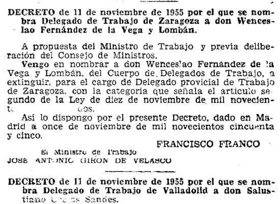 El padre de María Teresa Fernández de la Vega sí fue alto funcionario con Franco, algo que ella ha negado. Adjuntamos fragmento del nombramiento. DECRETO de 11 de noviembre de 1955 por el que se nombra Delegado de Trabajo de Zaragoza a don Wenceslao Fernández de la Vega y Lombán. Boletín Oficial del Estado núm. 325, de 21/11/1955. Atentos a quien lo firma…