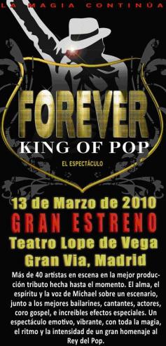 Eso es: FOREVER KING OF POP El Espectáculo. Un gran espectáculo tributo, con 40 artistas en escena, en la mejor producción hecha hasta el momento en España. El alma, el espíritu y la voz de Michael sobre un escenario con increíbles efectos especiales. Un espectáculo emotivo, vibrante, con toda la magia, el ritmo y la intensidad de un gran tributo al Rey del Pop.