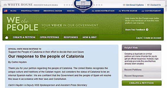Redacción. Una petición popular iniciada en noviembre de 2012 por un ciudadano norteamericano para solicitar el apoyo del Gobierno de los Estados Unidos a la consulta independentista de Artur Mas en Cataluña, ha sido oficialmente rechazada por Washington, que lo considera “un asunto interno español que deberá resolver el Gobierno y el pueblo de España de acuerdo con sus leyes y la Constitución”.