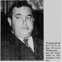 Convertir a un asesinado víctima de un enfrentamiento armado no es una idea original ni de Ruiz Alonso ni de su informante (I.Herreros). Como se trataba de un diputado de Acción Popular y vicepresidente del Congreso, la muerte de Madariaga no podía pasar desapercibida como la de otros miles de españoles que estaban sucumbiendo en los mismos días como consecuencia de la actividad represiva de aquellos utópicos milicianos. La prensa incautada en Madrid publicó «que en un choque habido cerca de Escalona (Toledo) entre fascistas y campesinos, halló la muerte el diputado cedista D.Dimas Madariaga. No es necesario advertir que éste figuraba en el grupo fascista» (ABC, 29-julio-1936: http://hemeroteca.abc.es/nav/Navigate.exe/hemeroteca/madrid/abc/1936/07/...). No hubo tal grupo, ni tal choque como I.Herreros ha hecho creer a José María Ruiz Alonso siguiendo probablemente la información publicada en el ABC madrileño o en otros periódico como La Vanguardia de Barcelona que se hacía eco de un telegrama enviado desde Escalona y difundido por el periódico socialista Claridad (La Vanguardia, 29-julio-1936: http://hemeroteca.lavanguardia.es/preview/1936/07/01/pagina-12/33134422/...). En agosto de 1939 varios de los criminales caían en manos de la policía (http://hemeroteca.lavanguardia.es/preview/1936/07/01/pagina-8/33114490/p...). El nombre de alguno de estos asesinos, juzgado en consejo de guerra y ejecutado, figura en esas relaciones de “víctimas del franquismo” que tanto difunden los voceros de la memoria histórica y nos instruye acerca de la naturaleza de lo que realmente ocurrió.