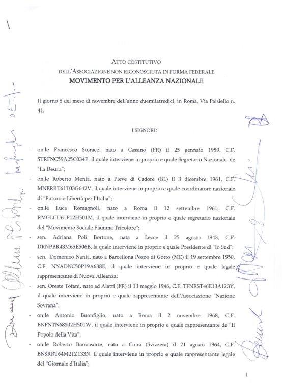 A este proyecto se han sumado Francesco Storace por La Destra; Luca Romagnoli por la FiammaTricolore; Adriana Poli Bortone por el Partido del Sur; Roberto Menia por Futuro y Libertad; DomenicoNania por Nueva Alianza; OresteTofani por la Asociación “Nación Soberana”; AntonhioBuonfiglio por “El pueblo de la vida”; y Roberto Buoanforte, director de “Giornaled´Italia”. Quienes desde las viejas siglas de AN, y con la reconstrucción de Forza Italia por Silvio Berlusconi, vuelve a reconstituirse un campo de centroderecha basado en el liberalismo, y otro de derecha, marcado en su matriz católica y nacional italiana. Ahora se abre una segunda etapa de encuentros con el antiguo edil de Roma, Gianni Alemanno, y los Fratellid´Italia, quienes procedentes del tronco común de la antigua AN, y que obtuvieron una pequeña representación al lado de “IlCavaliere”.
