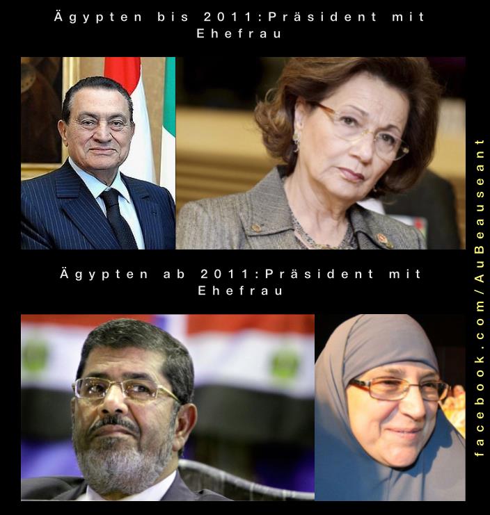 La Lupa del YA. En esta imagen que nos facilita Manuel Morillo, observamos al anterior presidente de Egipto y al actual, junto a sus mujeres. Solo mirando las fotos observamos la radicalización a las que se ha sometido el país egipcio tras su Primavera Arabe. ¿Quién es el responsable en Occidente de apoyar estas supuestas revueltas por la libertad?