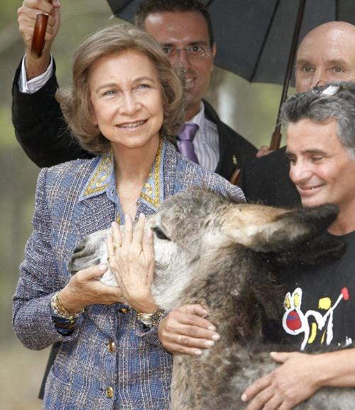 La Reina Doña Sofía visitó ayer las instalaciones de la Fundación "Casa del Burro", en Rute (Córdoba), donde ha bautizado con anís a "Lluvia", un burrito con poco más de un mes de vida.