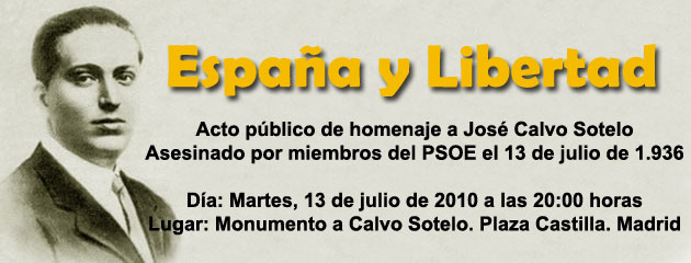 Ya está todo preparado. El martes, 13 de julio de 2010 a las 20:00 horas, en el Monumento a Calvo Sotelo en la Plaza Castilla de Madrid, se celebrará "un acto de homenaje como este debe estar abierto a todos aquellos que se consideren patriotas españoles y que se opongan a la mal llamada ley de memoria Histórica”. Con la participación del periodista Enrique de Diego, el historiador Pío Moa, el abogado de Alternativa Española (AES) Carlos Martínez-Cava y Yolanda Morín de la plataforma España y Libertad.