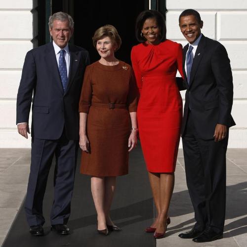 Tras una recepción en las puertas de la residencia, donde los cuatro se besaron y abrazaron amistosamente, Bush y Obama discutieron cuestiones de política nacional e internacional, y aunque Perino no ofreció detalles específicos sobre la conversación, tenían previsto dar prioridad al tema de seguridad nacional y la guerra en Irak.