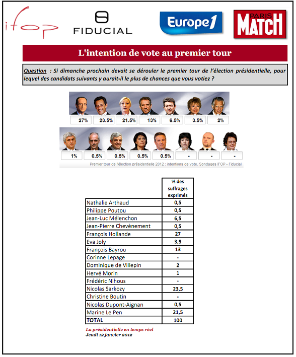 Según los resultados de esta encuesta, el socialista François Hollande se haría con el 27 por ciento de los votos, mientras que Sarkozy conseguiría el 23 por ciento y Le Pen el 21 por ciento. Así, el presidente vería su porcentaje caer en dos puntos porcentuales, mientras que la candidata del Frente Nacional asciende en 3,5 puntos.