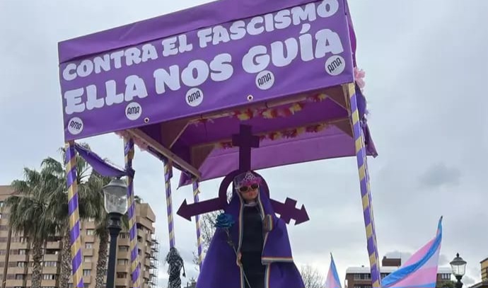Ayer un grupo de “individuas” ocultas bajo pasamontañas transportaron, en la manifestación del “Día de la Mujer”, una paródica imagen de La Santina, vestida con feministoide manto morado y acompañada de carteles tan ocurrentes como “Santina Queer”, o “Santina, líbranos del fascismo”.
