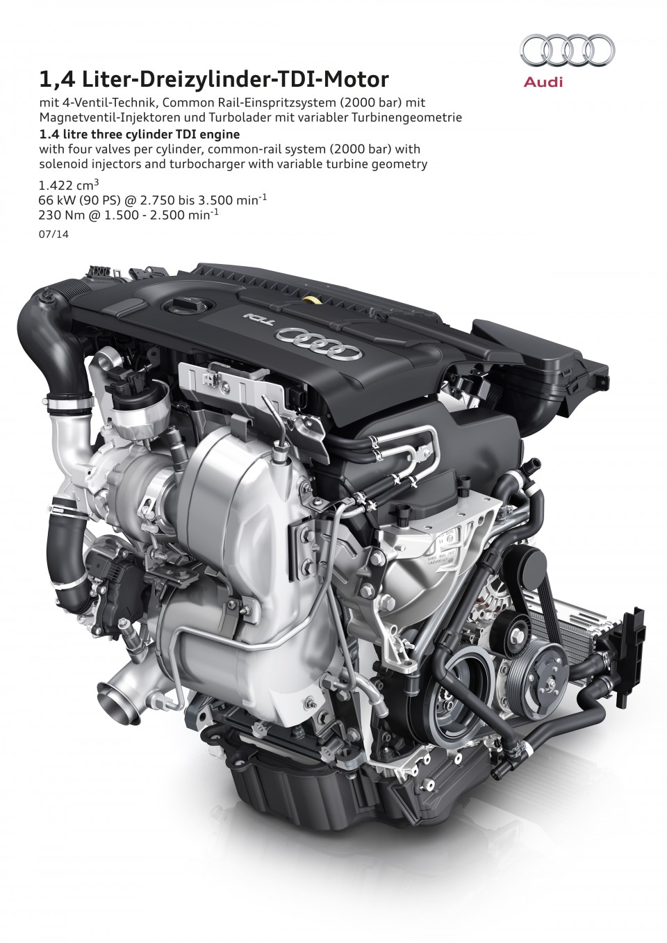 Carlos Pascual. El nuevo motor TDI de 1.4 l de desplazamiento, es un tricilíndrico diseñado para montarse en posición transversal, y pronto se iniciará si fabricación en serie. Este pequeño TDI, del grupo VAG, obtiene 90cv de potencia y 230Nm de par plano entre las 1.500 y 2.500 rpm, posee la carrera heredada del dos litros TDI, 95,5mm y reduce el diámetro de los cilindros a 79,5mm dejando su cilindrada en 1.422cc.