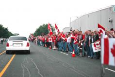 El resto de las imágenes corresponden al recorrido por carretera del convoy fúnebre. Los 167 kilómetros que separan la base de Trenton del Instituto Anatómico Forense de Toronto están llenos de ciudadanos con banderas y pancartas con mensajes de apoyo, coches de policía y camiones de bomberos estacionados en los arcenes, con sus tripulantes llevándose la mano al corazón al paso de la comitiva.