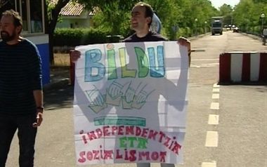 El etarra Andrés Errandonea Arruti ha enarbolado una bandera de Bildu nada más recuperar la libertad tras 25 años en prisión. La pancarta, de aproximadamente un metro de largo y otro de ancho, está confeccionada a mano y aparece el nombre de la coalición en colores verde azul y amarillo. Debajo se pueden apreciar varias manos votando en una urna y la proclama 'Independentzia ETA Sozialismo' (Independencia y Socialismo). Cabe destacar que los autores de la pancarta han aprovechado que 'ETA' (y en euskera) coincide con las siglas de la banda terrorista para destacarlo en otro color y otra escritura. A su salida de prisión uno de los familiares que acudió a la cárcel para recibirle le entrega la pancarta plegada y es en ese momento en el que el Errandonea se sitúa delante de los medios de comunicación que se encontraban en la zona para desplegarla. A continuación, los familiares y amigos del etarra se sitúan junto a él detrás de la pancarta y, puño en alto, proceden a cantar el 'Eusko Gudiariak', canción al "soldado vasco" con la que la izquierda abertzale cierra todos sus actos y que ya entonaron los simpatizantes de Bildu el día de su presentación en San Sebastián. El preso histórico de ETA Andrés Errandonea Arruti ha salido pasadas las 10.30 horas de este martes del centro penitenciario Herrera de la Mancha, tras haber cumplido una condena de casi 25 años. A las puertas de la prisión le esperaba una veintena de personas, entre amigos y familiares, que le han recibido con pancartas, banderas de Euskadi y de Etxerat y gritos para festejar su libertad. En su celebración, los familiares han proferido gritos en favor de la amnistía para los presos vascos en incluso han llegado a gritar la consigna etarra 'jo ta ke irabazi arte' (darle duro hasta conseguirlo). Errandonea, que portaba dos bolsas e iba vestido con unos pantalones tejanos y una camiseta negra, ha respondido a este recibimiento con sonrisas y alzando el puño o haciendo gestos para que gritasen más alto. En otro momento es el preso el que llega a dirigir los cánticos aún en el interior del recinto. Andrés Errandonea Arruti forma parte del grupo de cinco veteranos de la banda que han recuperado la libertad entre los meses de abril y mayo. Fue detenido también el 17 de mayo de 1986 por la Guardia Civil en Oyarzun, acusado de pertenecer al 'comando Irrintzi'. Este grupo fue desarticulado pocas horas después de que ametrallara un camión francés en la autopista Bilbao-Behovia. La Guardia Civil les atribuyó varios ametrallamientos de otros tantos camiones franceses, y un intento de atentado contra agentes de la Guardia Civil que vigilaban un colegio electoral en el referéndum de la OTAN. Al comando le fue incautado diverso armamento. Errandonea Arruti, que sale del centro penitenciario de Herrera de la Mancha, ingresó en prisión con 23 años y la abandona con 47.