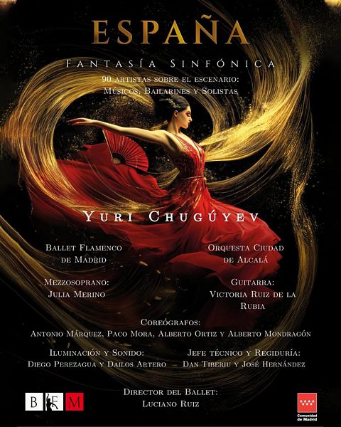 España, Fantasía Sinfónica, creación del Maestro Yuri Chugúyev, es mucho más que un concierto. Se trata de un espectáculo profundamente innovador que combina la música sinfónica en vivo con la danza española, la guitarra clásica, el cante y un despliegue visual envolvente que proyecta en 4K el alma y patrimonio de nuestro país. A de esta fusión multidisciplinar, la obra propone una experiencia sensorial inmersiva que rompe los límites del escenario tradicional, transportando al espectador a un viaje emocional por la geografía, la historia y la identidad cultural del país. Más de 100 artistas en escena —entre músicos, bailarines, solistas y técnicos— dan vida a una propuesta artística sin precedentes, que une tradición y vanguardia con un alto valor estético y simbólico.