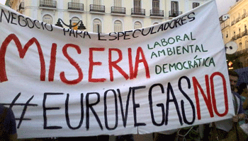 Diario Ya. La Plataforma Eurovegas NO ha reunido a más de un centenar de personas a las 19,00 horas del martes en la Puerta del Sol, frente al gobierno de la Comunidad de Madrid, para reivindicar su desacuerdo con la implantación de Eurovegas y coincidiendo con la visita del empresario estadounidense Sheldon Adelson a Madrid.
