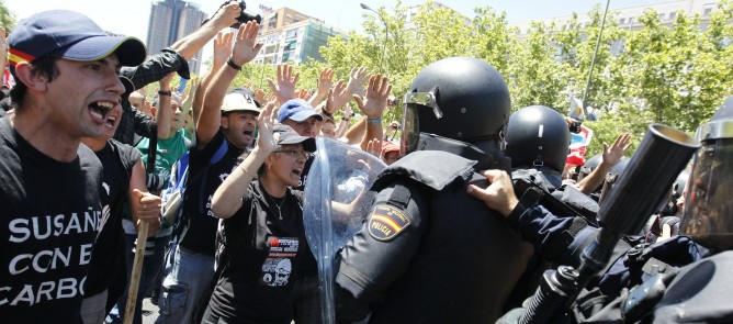 Diario Ya. Se han registrado dos enfrentamientos de importancia entre los mineros y la policía antidisturbios en Madrid, uno frente al Ministerio de Industria en el Paseo de la Castellana, y el segundo, cerca del estadio Santiago Bernabeu, y ambos provocados por el lanzamiento de piedras y petardos a los furgones de la policía, que han alcanzado a algunos agentes, mientras les llamaban ‘violentos’ o ‘terroristas’.