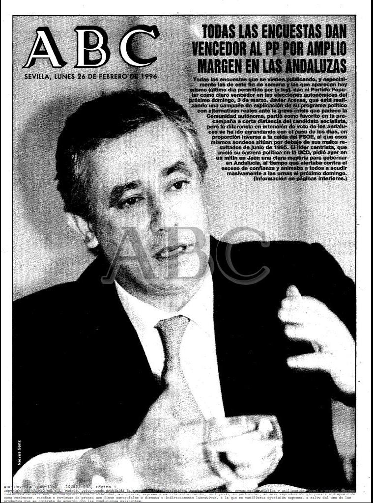 Redacción. Dieciseis años después la historia se repite. De nuevo el PP era el favorito para ganar en Andalucía. De nuevo Arenas ganaba, según las encuestas. Y de nuevo el batacazo. Esta portada del ABC del lunes 26 de febrero de 1996 es buena muestra. Ver para ceer.