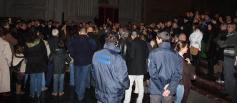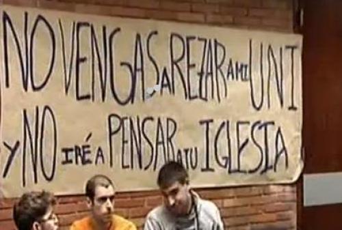 Este es el mensaje que se ve en la universidad. Izquierdistas radicales impiden la entrada a la capilla de la Facultad de Historia. La protesta estudiantil que a finales de la semana pasada terminó con el bloqueo de la entrada a Madrid por la A-6 y pintadas en los leones del Congreso tuvo también su repercusión en la Facultad de Geografía e Historia de la Universidad Complutense.