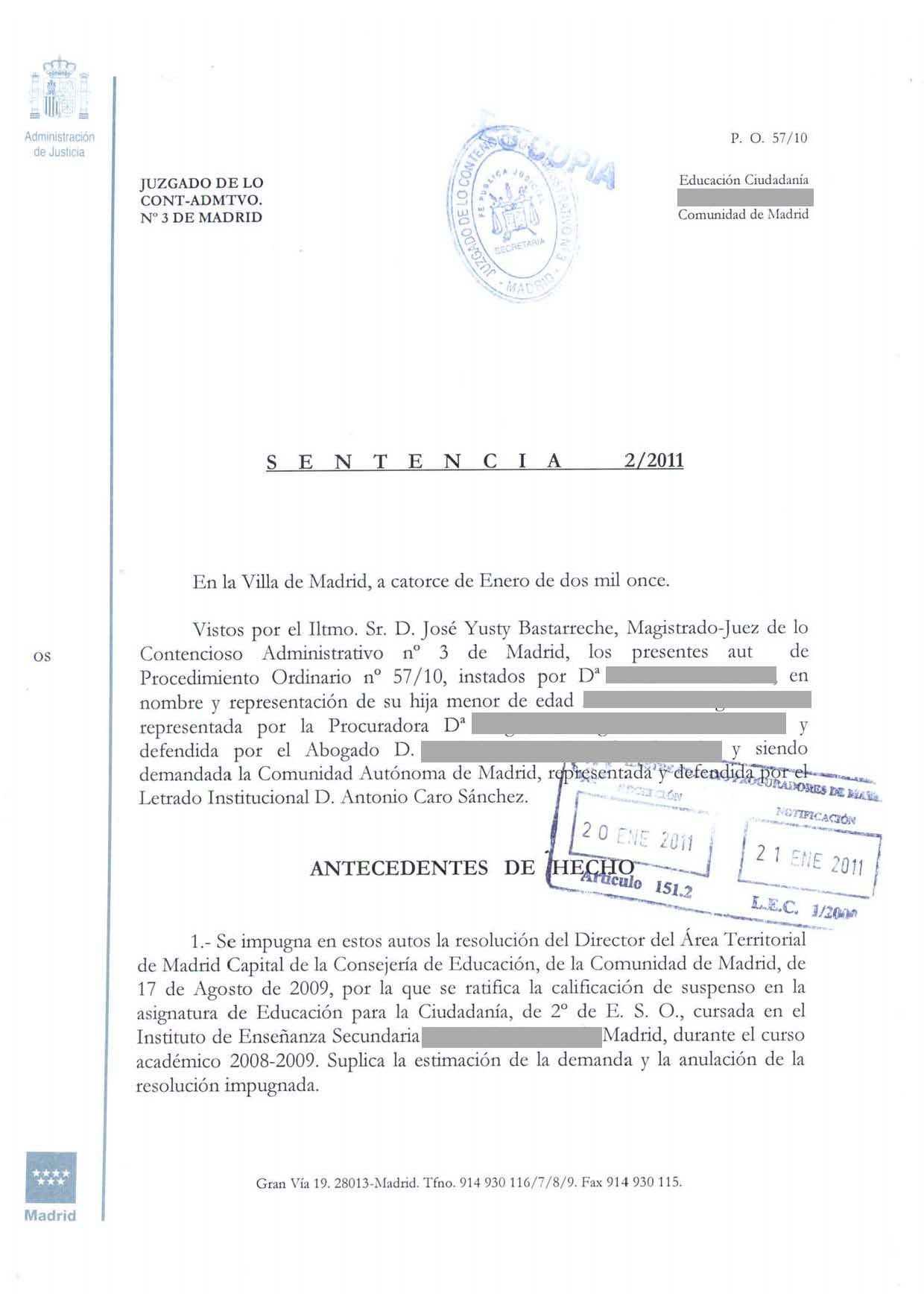 Teresa García de Noblejas. Profesionales por la Ética. Esta misma semana una familia madrileña ha vivido un hecho insólito: una hija suya, objetora a Educación para la Ciudadanía (EpC) ha recibido sentencia judicial del Juzgado de lo Contencioso-Administrativo nº 3 de Madrid que la declara aprobada en la asignatura de Educación para la Ciudadanía de 2º de ESO. «Es un hecho notorio», afirma la sentencia, «,que no necesita prueba, que la introducción de dicha asignatura en los planes de estudio ha causado una notable polémica, con posturas enfrentadas en y fuera de los Tribunales».