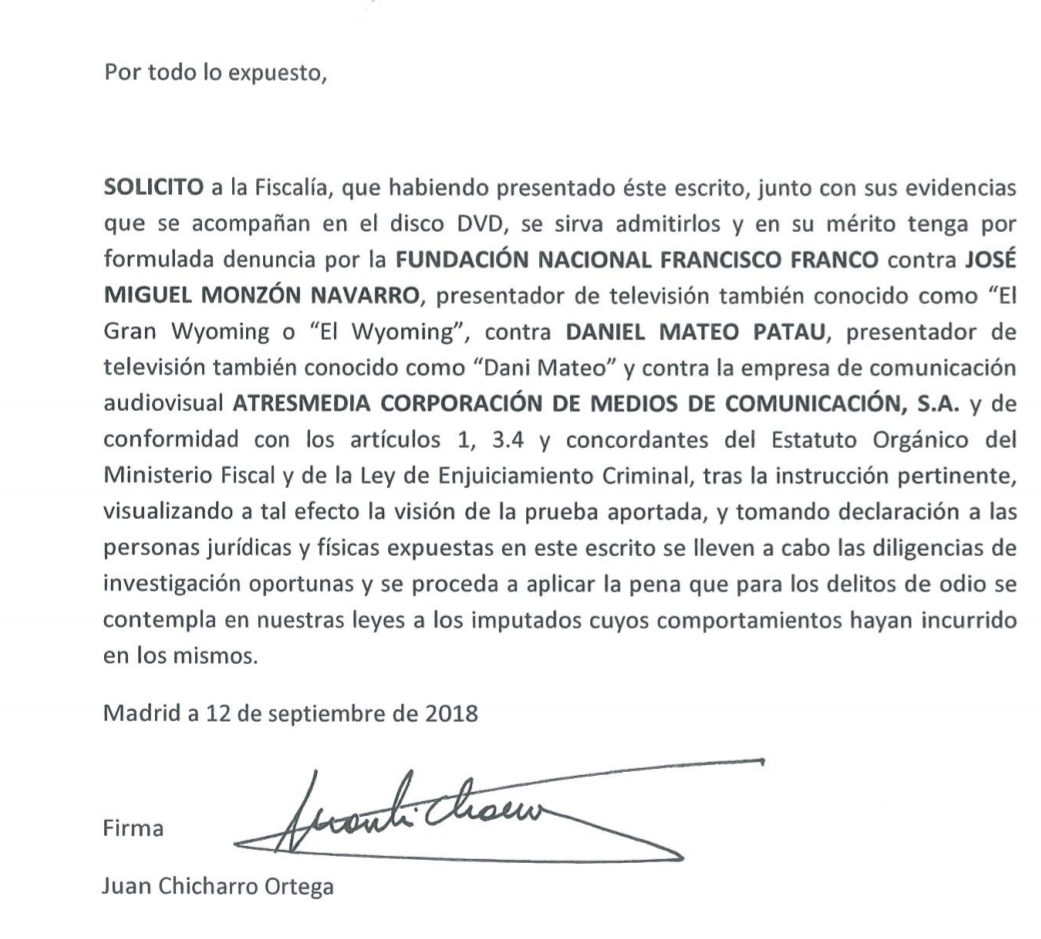 Siguiendo un trabajo muy profesional, la Fundación Nacional Francisco Franco ha denunciado definitivamente al conocido como Gran Wyoming tras su grave burla reciente en relación a la tumba de Francisco Franco. Ahora se las tendrá que ver con la Justicia.