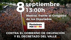 La plataforma ciudadana Movimiento por España ha convocado para este sábado 8 de septiembre a las 13:00 horas una manifestación ante el Congreso de los Diputados* con el lema de “Contra el gobierno de okupación y el decretazo del Valle”. El objeto de manifestarnos ante el Congreso es pedir a los partidos de la Oposición que sean leales a la voluntad de sus votantes expresada en las encuestas sobre el tema, en las que en el PP una gran mayoría se opone a la exhumación (86%)