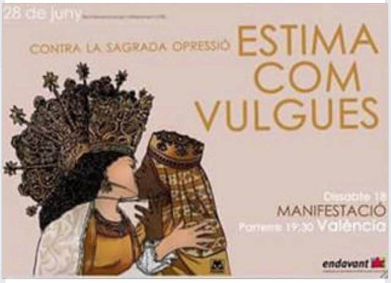 La asociación de extremaizquierda, autodefinida como anticapitalista, uno de cuyos referentes es la CUP, Endavant, al viento de las celebraciones del llamado "Día del orgullo" gay ha convocado o se ha sumado a tres manifestaciones que con el insultante lema "Contra la sagrada opresión", en referencia a la Iglesia y los católicos, se realizarán en Valencia, Palma y Barcelona.