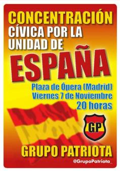 Redacción. El próximo viernes 7 de noviembre a las 20:00 en la Plaza de Isabel II (Metro de Ópera) un grupo de jóvenes llamado Grupo Patriota convoca una concentración por la unidad de España, con motivo de la consulta secesionista que pretende presentar el presidente de la Generalidad Artur Mas.