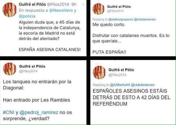 La Lupa. Pues si. Mensajes como este se encuentran por la red y demuestran la lamentable situación psicicosocial en la que se encuentran algunos, que sólo necesitan que los políticos encendan la mecha. Por otro lado la manipulación del atentado para aprovechar a hacer propaganda catalanista ha sido vergonzosa. Veamos: