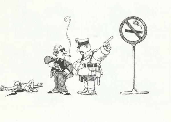 La Lupa del YA. Ha sido tuiteado por el obispo Munilla. Un matón que parece acaba de disparar a un cristiano es regañado por un policía, pero no por el ataque, sino por estar fumando delante de un cartel de prohibido fumar. Como dice, "cuando occidente desprecia la moral de inspiración cristiana, acaba fundando la ética en lo políticamente correcto".