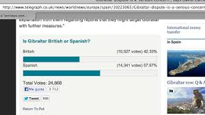 Está teniendo lugar en el periodico The Telegraph. La encuesta es clara: ¿Es Gibraltar español o inglés? Más de un 60 % ha votado a favor de que es español, y han participado miles de votantes. Si quieres participar puedes hacerlo AQUÍ