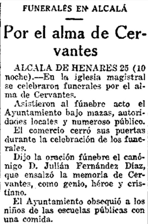 El próximo viernes, 29 de abril, a las 19:30 horas, en la Catedral-Magistral de Alcalá de Henares, se celebrará un solemne funeral por el alma de don Miguel de Cervantes Saavedra. Presidirá la Santa Misa el Obispo de Alcalá de Henares Mons. Juan Antonio Reig Pla.