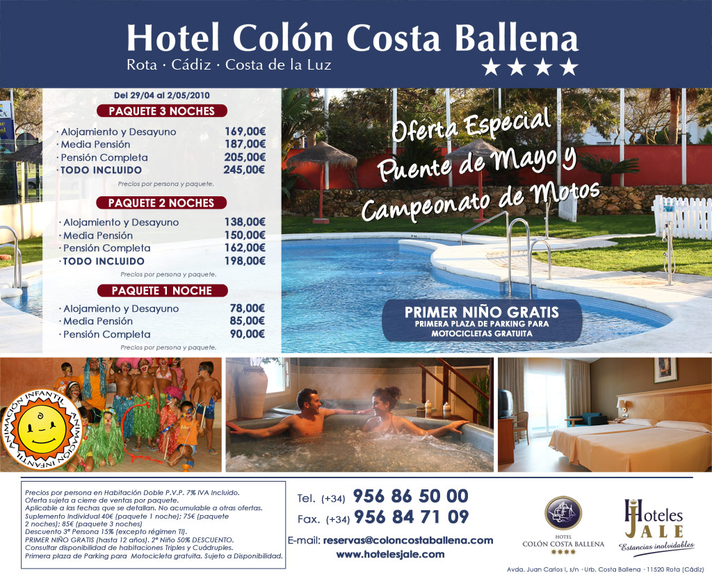 José Buitrago. Para disfrutar del Puente de Mayo y del Mundial de Motos en Jerez el Hotel Colon de Costa Ballena ofrece unos precios especiales por persona y noche en habitación doble en régimen de "Alojamiento y Desayuno". Paquetes de 1, 2 o 3 noches desde 78,00€